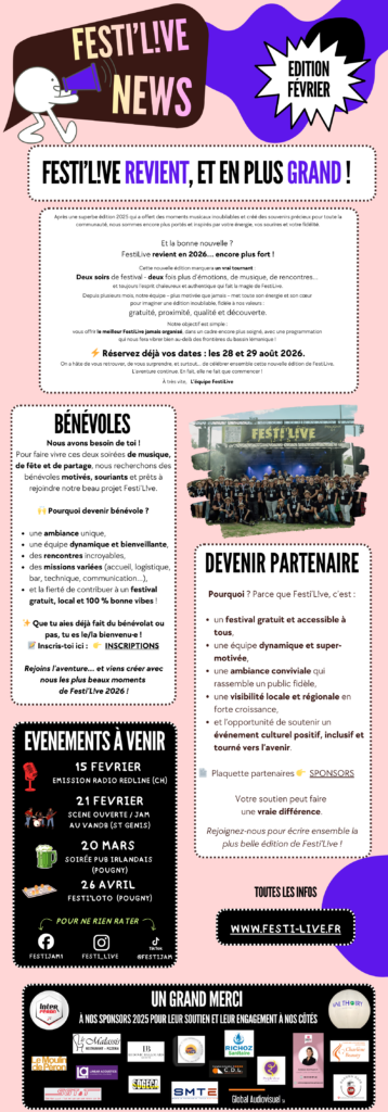 FESTI’LIVE REVIENT, ET EN PLUS GRAND ! 8e EDITION – 28 et 29 Août 2026 – Pougny (01-FR)
